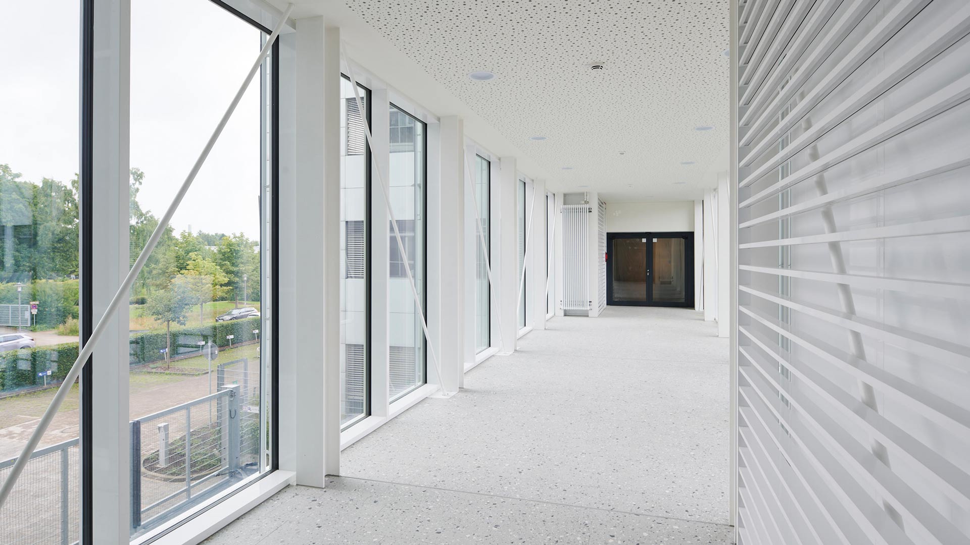 Der Neubau besteht aus insgesamt vier Vollgeschossen. Die Unterbauung des Neubaus erfolgt mit einem ca. 2.400 m² großen Untergeschoss als Tiefgarage. Im Erdgeschoss befinden sich der Logistikbereich sowie die an den Hauptzugang angegliederten Umkleide- und Sozialräume der Labormitarbeiter:innen. Im ersten- bis dritten Obergeschoss befinden sich die Laborbereiche und Büroarbeitsplätze. Die drei Laborgeschosse sind über ein Atrium miteinander verbunden, was im Gebäudeinneren der Kommunikation und Sichtverbindung der einzelnen Abteilungen untereinander dient.