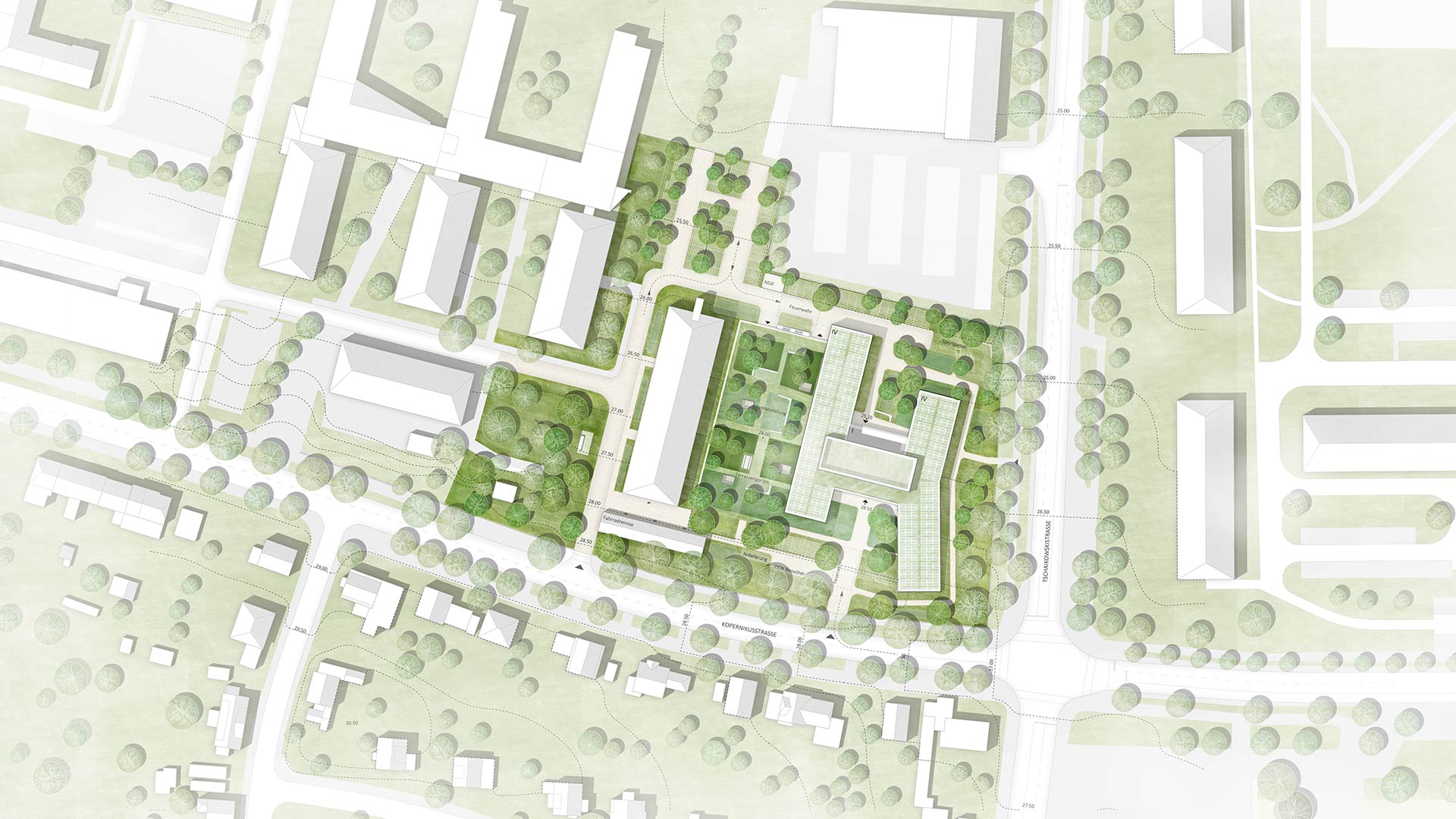 Der Verwaltungsbau ist in serieller Holzhybridbauweise geplant und behält in seiner Nord-Süd-Ausrichtung die städtebauliche Struktur des ehemals großflächigen Kasernengeländes und der bestehenden Zeilenbauten bei, löst sich aber mit seiner Kubatur aus der Regelmäßigkeit der umgebenden Architekturen. Im Gegenüber zur kleinteiligen Wohnbebauung mit ihren Gärten und Vorgärten ermöglichen die giebelseitigen Fronten des Neubaus eine verträgliche Körnung für die Nachbarschaft und lassen auch weiterhin Einblicke in den Freiraum zu.