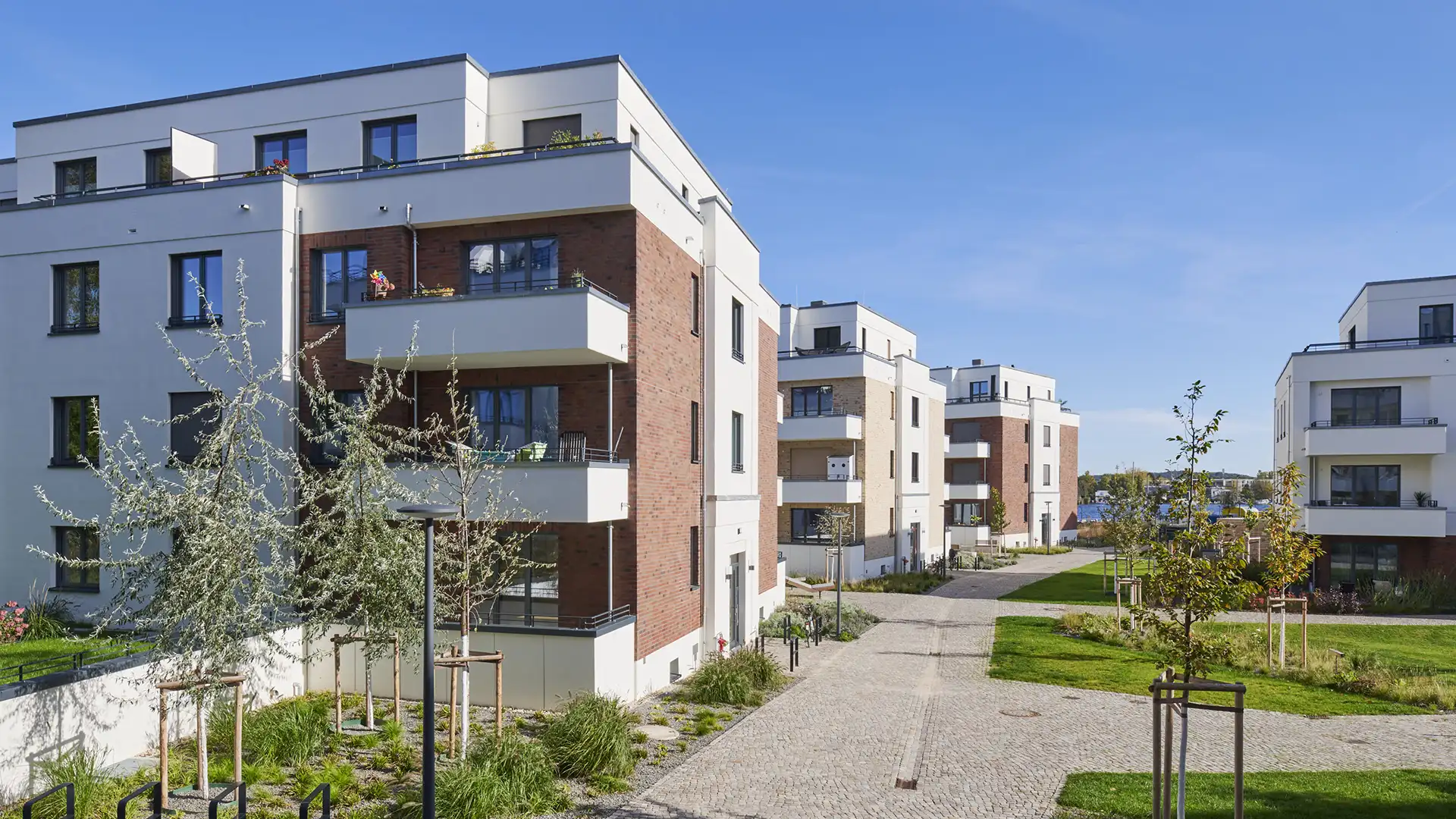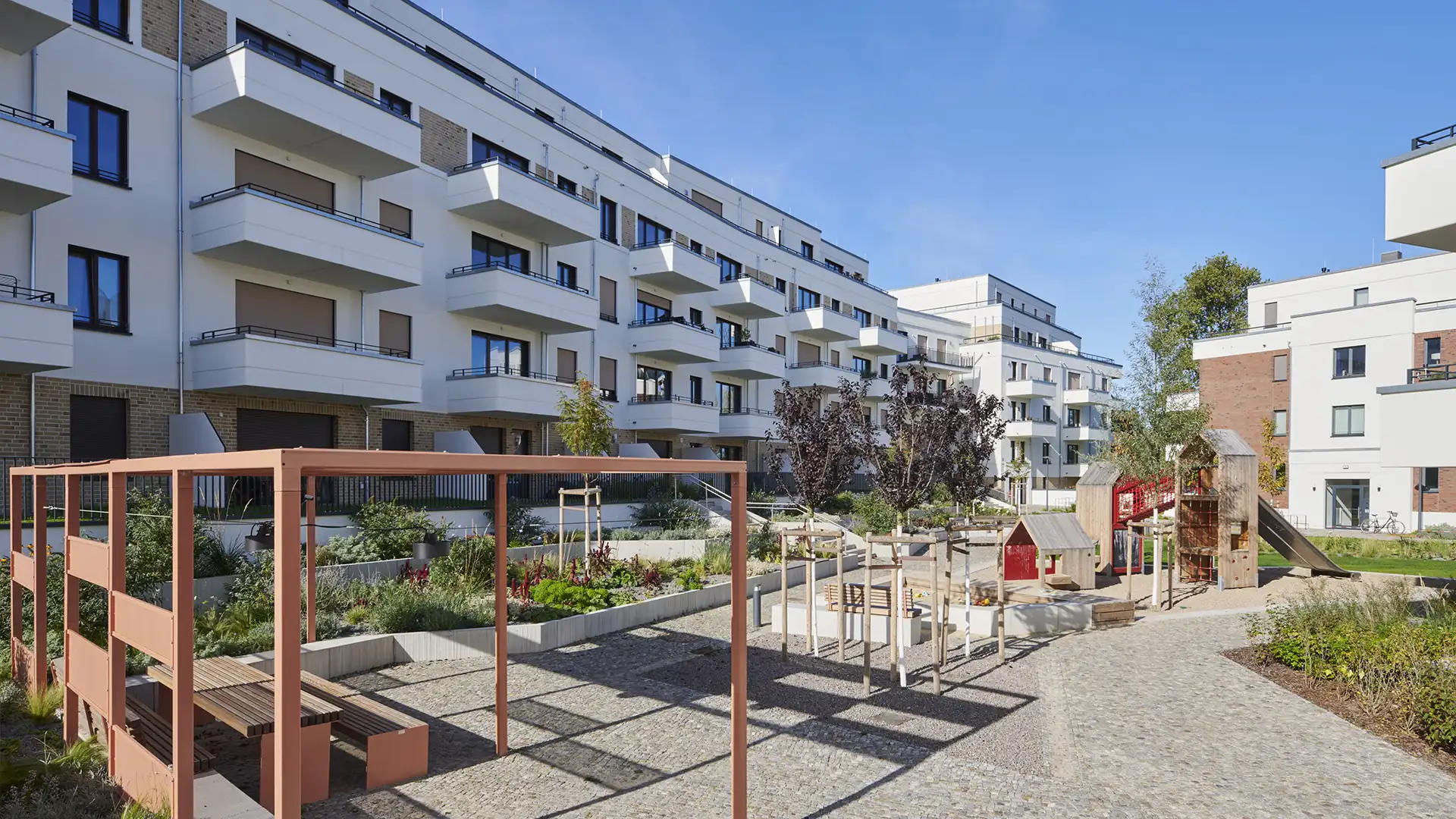 Das Ensemble ist oberirdisch autofrei angelegt. Ergänzt wird das Quartier durch großzügige Grünflächen, ein eigenes Nahwärmenetz sowie eine Kindertagesstätte.